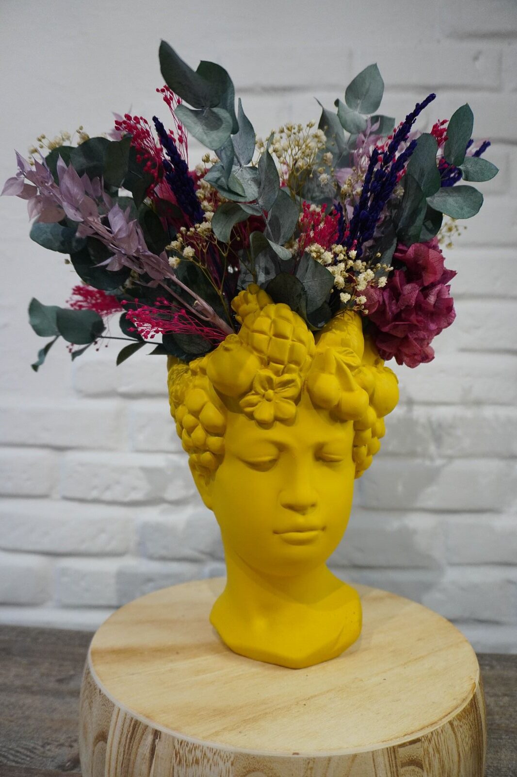 Centro colorido, con flores preservadas en cabeza de cerámica.