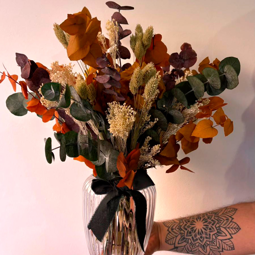 Este ramo combina verdes preservados con flores secas, creando un arreglo natural, elegante y de larga duración. Los verdes preservados mantienen su frescura y textura, mientras que las flores secas aportan color y un toque rústico que se conserva durante meses sin necesidad de cuidado.