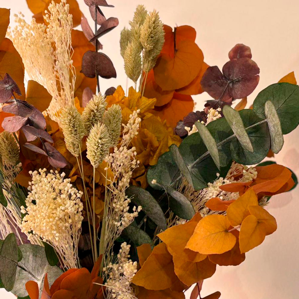 Ramo con verdes preservados y flores secas, elegante y duradero.