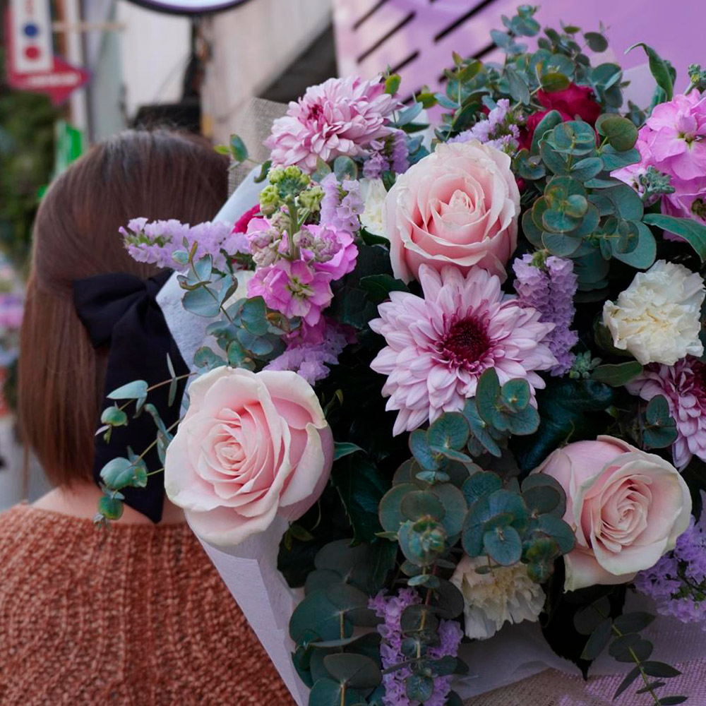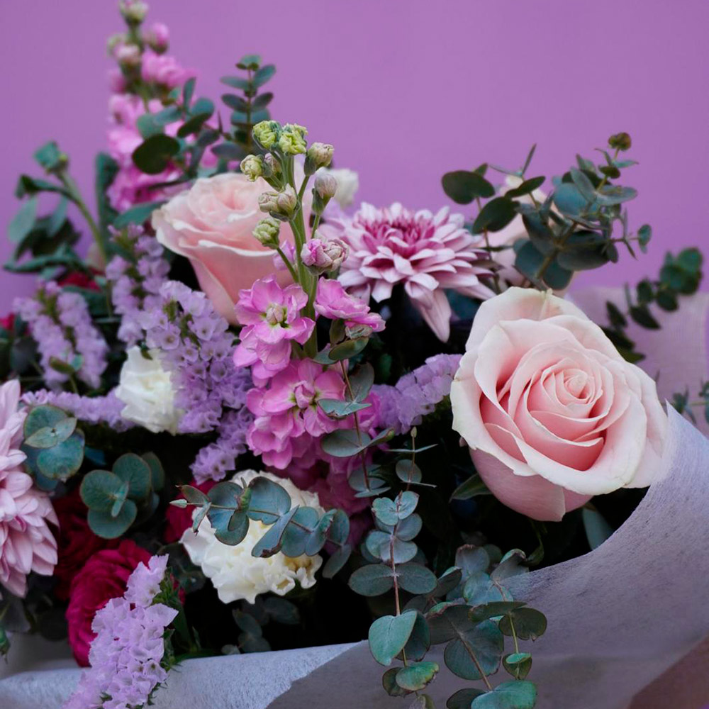 Ramo de flores naturales en tonos rosas, lilas y blancos.